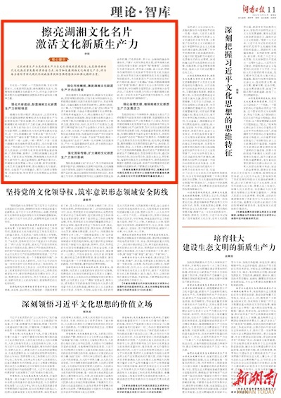 文化新质生产力是新质生产力在文化领域的表现形态,也是推动新时代文化高质量发展的重要着力点。培育和发展湖湘文化新质生产力,将为奋力谱写中国式现代化湖南篇章提供坚强思想保证和强大精神力量。