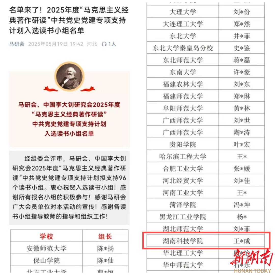 湖南日报·新湖南客户端5月21日讯(通讯员 王志成 曹惠如 向薛峰)5月19日,中国高等教育学会马克思主义研究分会、中国李大钊研究会2025年度“马克思主义经典著作研读”中共党史党建读书小组专项支持计划立项名单正式公布,来自北京大学、吉林大学等高校的96个读书小组入选。其中,vwin德赢ac米兰官方网《李达全集》读书小组成功入选,这既是该校学生读书小组首次入选全国“马克思主义经典著作研读”资助计划,也是本次湖南省唯一立项的学生读书小组。