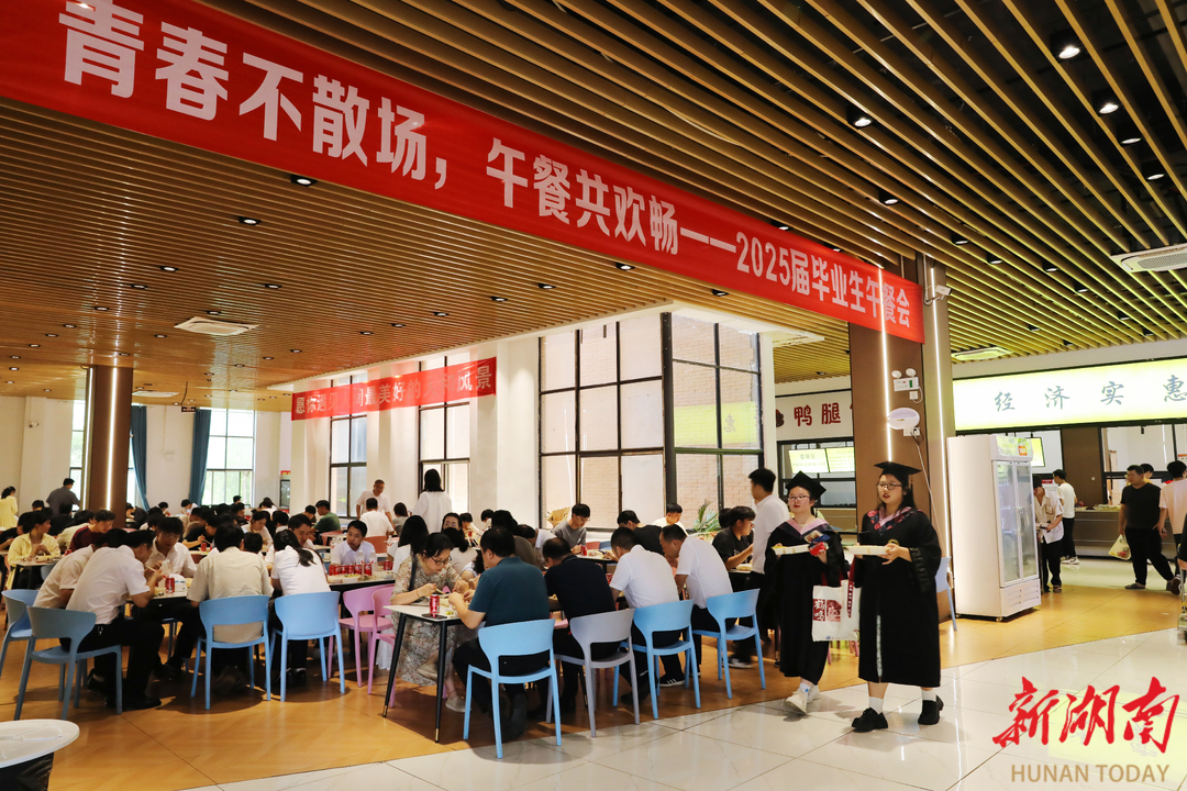 湖南日报·新湖南客户端6月7日讯 (通讯员 刘斌 向薛峰 谢志豪)6月5日中午,vwin德赢ac米兰官方网松园食堂、桃园食堂二楼欢声如潮,该校领导、毕业年级辅导员、班主任与千余名毕业生共享佳肴、共话未来,传递学校暖心又暖胃的深切祝福。
