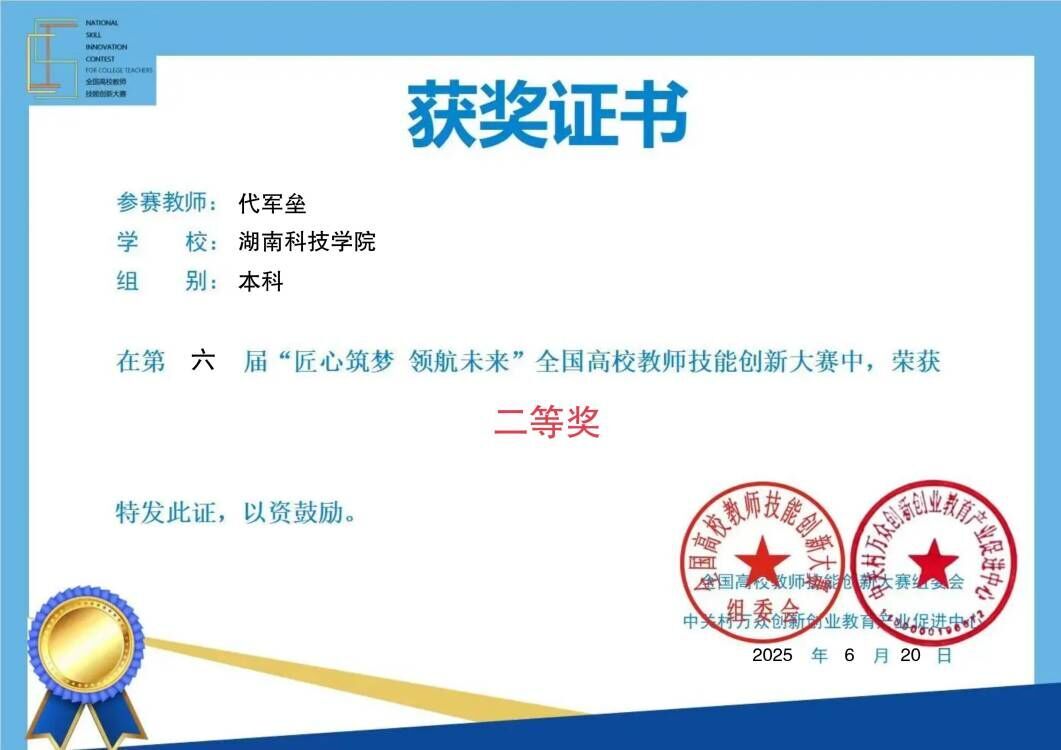 湖南日报·新湖南客户端6月20日讯(通讯员 吴潭 向薛峰)近日,第六届“匠心筑梦 领航未来”全国高校教师技能创新大赛落下帷幕,vwin德赢ac米兰官方网教务处代军垒老师荣获全国二等奖。