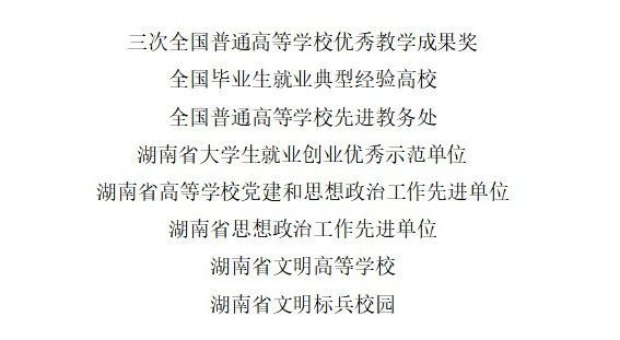 学校被教育部认定为“全国毕业生就业典型经验高校”“全国高校毕业生就业能力培训基地”、被科学技术部认定为“国家级众创空间”。“十四五”期间连续3次获“湖南省普通高等学校就业创业工作'一把手’ 工程优秀单位”。毕业生年终就业率超过90%。学生参加中国国际大学生创新大赛获国赛金奖1项,银奖4项,铜奖13项。在中国公办大学创新创业竞争力排行榜500强中位居284位。