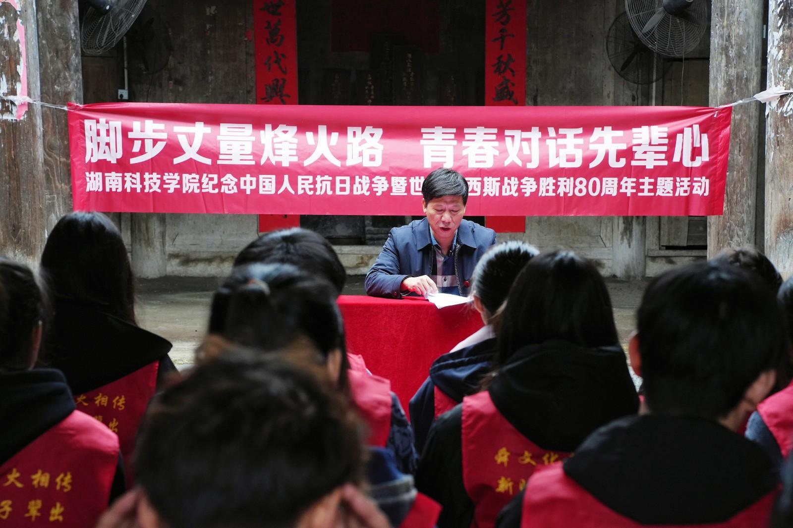 “我们学校四迁其址,七易其冠,1944年因日寇铁骑肆虐,为保存教育薪火,从道县迁至此地,不仅坚持正常教学,还积极开展抗日宣传,组织学生参与地方建设。”该校二级教授潘剑锋以学校旧址麦地村黄家宗祠为讲堂,向师生讲述了先辈们如何在战火中坚守教育事业的往事,介绍了从“湖南省立第七师范学校”到“vwin德赢ac米兰官方网”的筚路蓝缕。