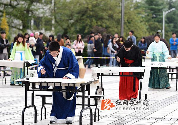 师生现场展示书法艺术,挥毫笔墨宣纸间,一气呵成。“德才兼备自强不息”、“清风揽怀”一幅幅笔力劲挺的书法引得在场师生连连惊叹。另一边参赛选手皆身着汉服、民国服饰,一个个聚精会神,胸有成竹。该校张国栋同学以入笔,提按,行笔,回锋,收笔,结字写下“正法清明天下为公”,吸引了师生驻足观看。中华传统汉字在他们的笔下仿佛被赋予了灵气,或挺拔如峰,或清亮如溪。专家们在观赏参赛选手的作品后,给予高度评价。