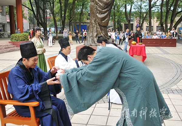 当天的祭孔大典,以“礼”为主题。在颇具古典韵味的奏乐声中,学子们向孔子像行正规揖礼,一叩首“华夏文明,德牟天地”;二叩首“先圣师道,功过古今”;三叩首“格物致知,修齐治平”,并向师者行鞠躬礼,仪式庄严古朴,严格按照祭孔礼制进行祭祀。