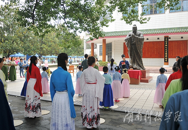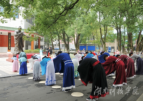 红网永州站9月27日讯(通讯员 熊玲芝 摄影 何帅文)“弟子规,圣人训,首孝悌,次谨信,泛爱众,而亲仁,有余力,则学文……”为纪念孔子诞辰2566周年,宣扬传统文化,弘扬尊师重道之精神,9月27日,在vwin德赢ac米兰官方网孔子雕像前,数十名学子身着朱子深衣,向孔子像鞠躬按照古礼行“释菜礼”,表达今人对圣贤的敬仰和怀念。