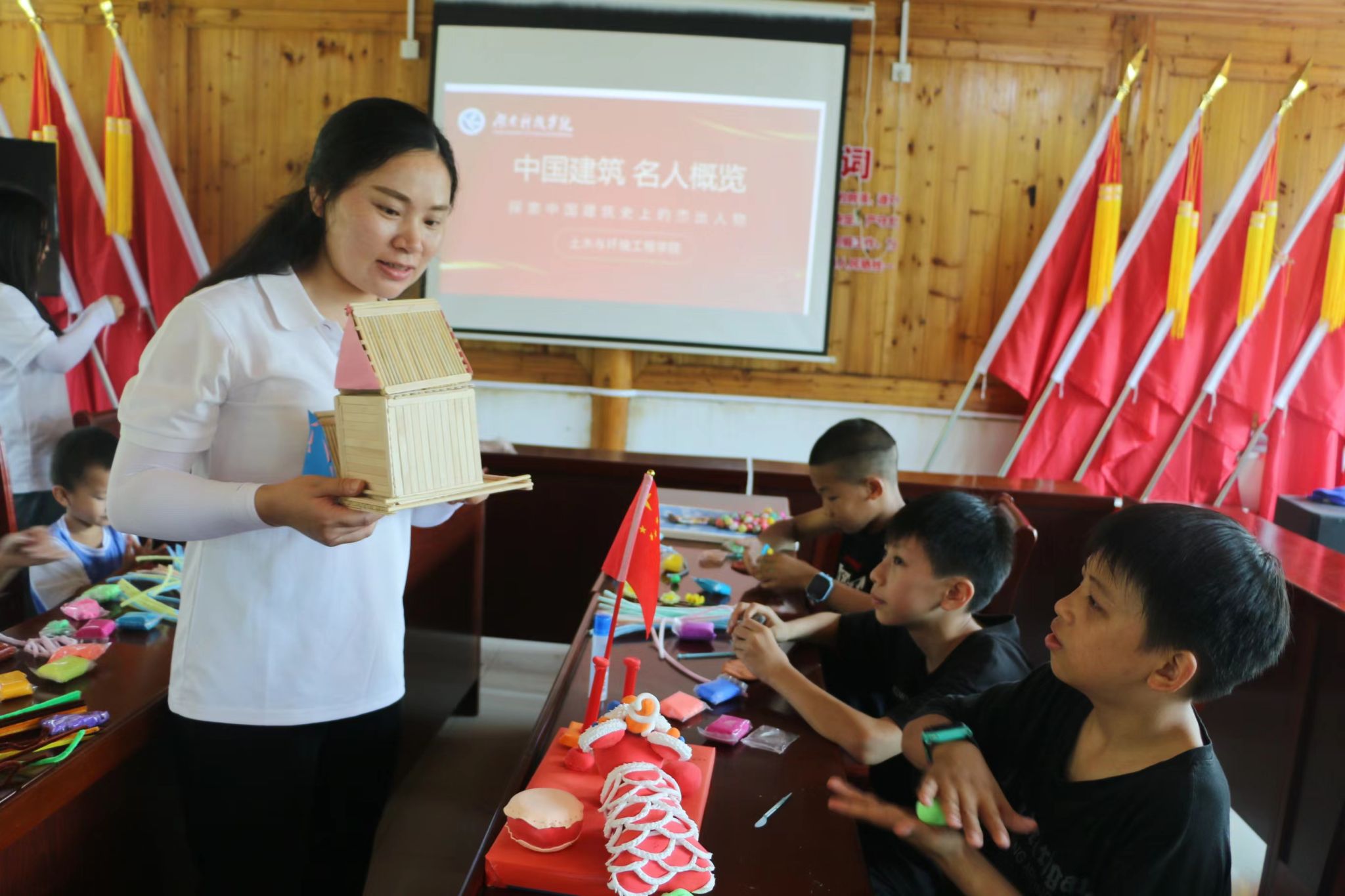 团队成员为孩子们讲述了我国著名工程师的故事和他们建设美好家园的梦想,还带着孩子们一起互动合作,利用扭扭棒、黏土、纸盒等材料制作手工艺品,体会建筑之美、实践之美。