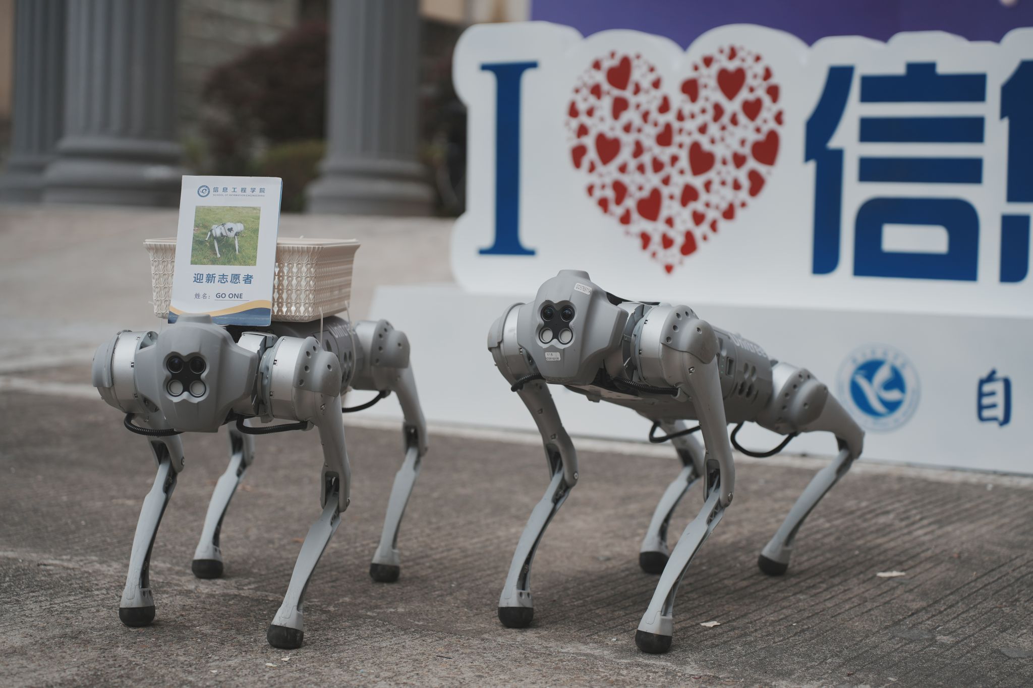 知行楼前,两只机器狗在门口迎接新生和家长。在操作员的指挥下,机器狗做出各种行云流水的动作,时而向家长作揖,时而给同学递水,憨厚的样子吸引着众多新生及家长的眼球,惹得新同学们拍手叫好。