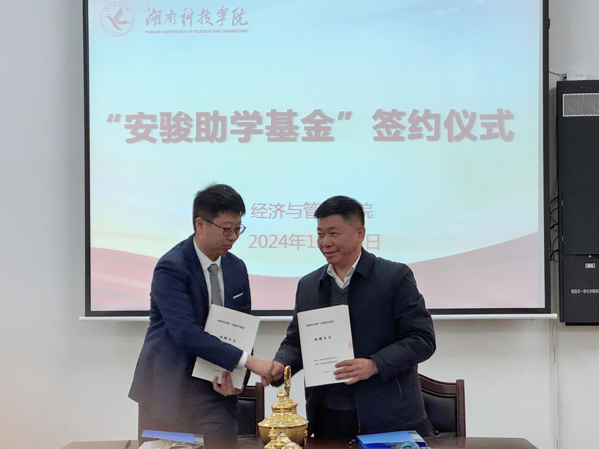 龙诗颐对深圳市安骏物流有限公司资助经济与管理学院贫困学生进行了感谢,陈泽代表经济与管理学院2002届优秀校友、深圳市安骏物流有限公司董事长方轲捐赠300万元设立助学金,陈泽还转达了方轲对母校的感恩之情和助力母校教育事业发展的心愿。