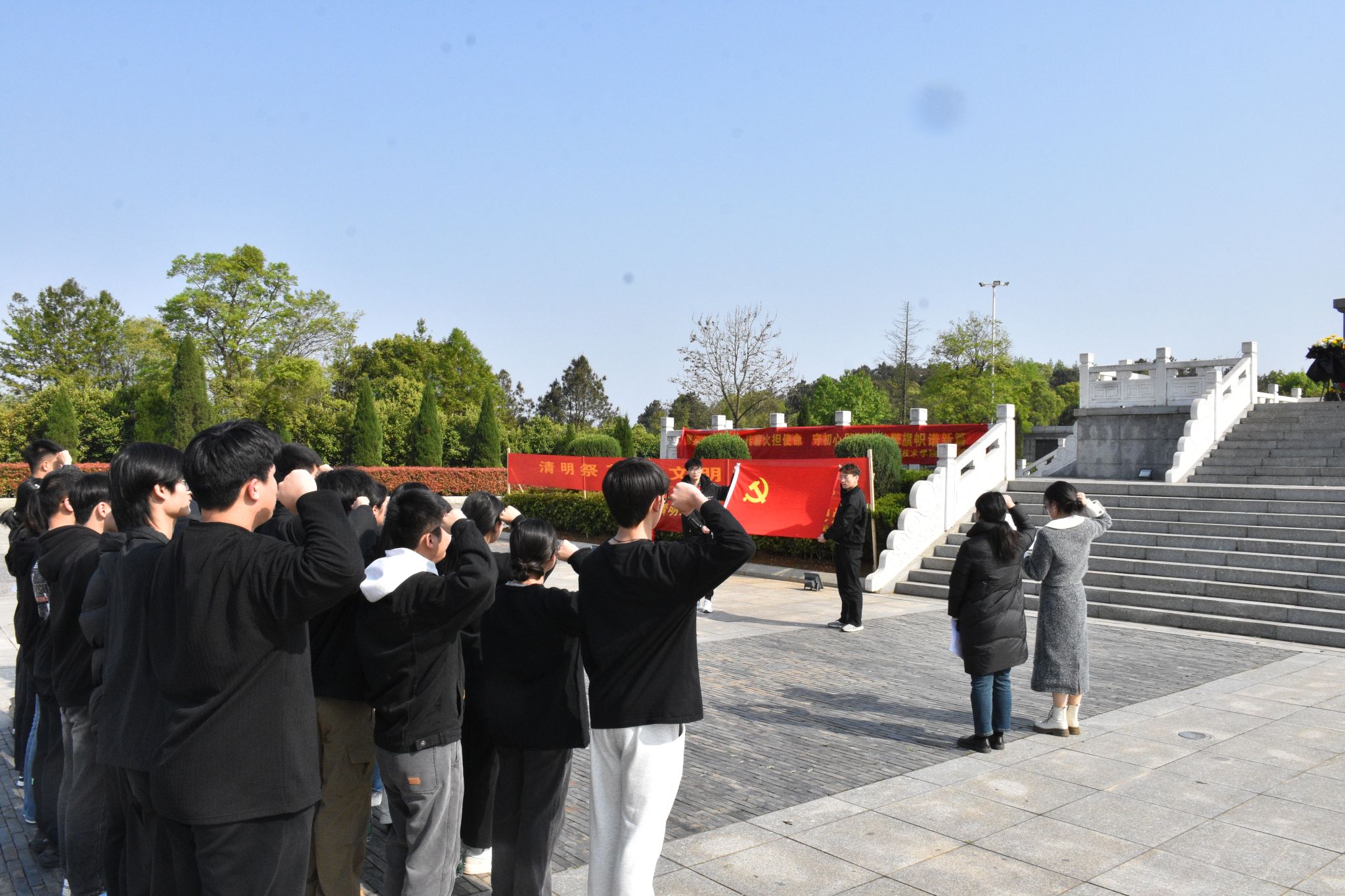 在烈士纪念碑前,全体党员整齐列队,庄严肃立,默哀三分钟,向为民族独立、人民解放和国家富强英勇献身的烈士们表达深切悼念,党员代表向烈士敬献花篮。