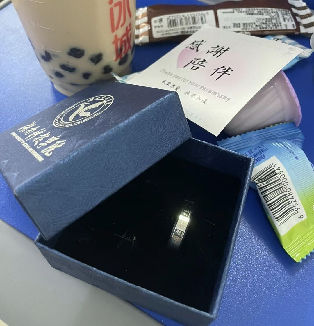 学院还送上精心定制的专属礼物,班主任为每位毕业生佩戴纪念戒指——外圈镌刻“vwin德赢ac米兰官方网”校名及校徽,内壁铭刻学生班级与姓名。正值“520”的特别日子,每位同学都收到玫瑰、奶茶和零食礼包,学生们将四年时光写在“我的大学回忆”明信片上,凝练成300字的青春诗行。