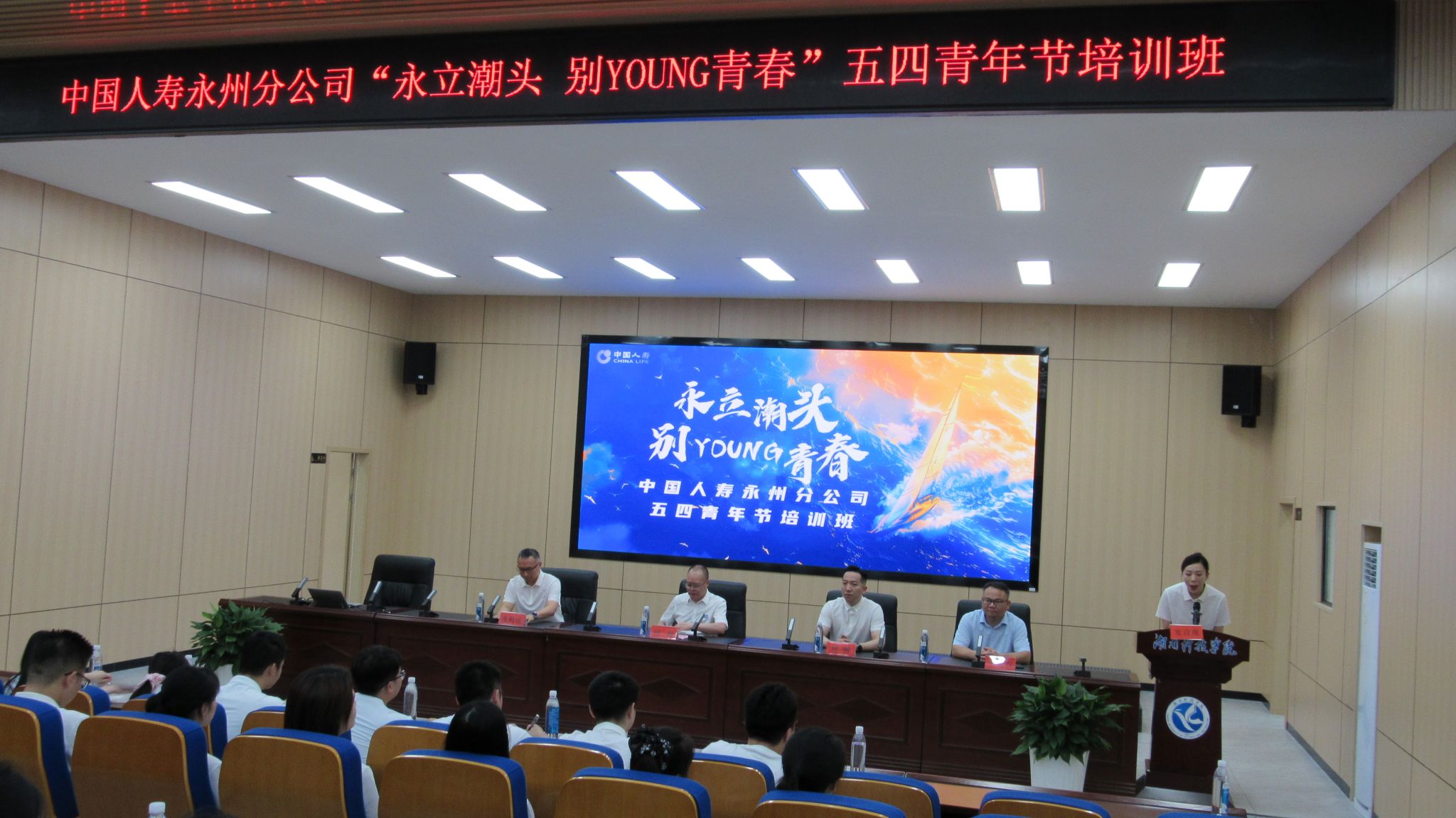本网讯(通讯员 邹小阳)5月22日,中国人寿永州分公司与vwin德赢联合举办的“永立潮头,别YOUNG青春”五四青年节培训班在vwin德赢举行。中国人寿永州分公司党委书记、总经理刘翀,中国人寿党委委员、总经理助理蒋周成及该公司的70名青年员工参加开班仪式,校党委委员、副校长何海出席并作开训致辞。