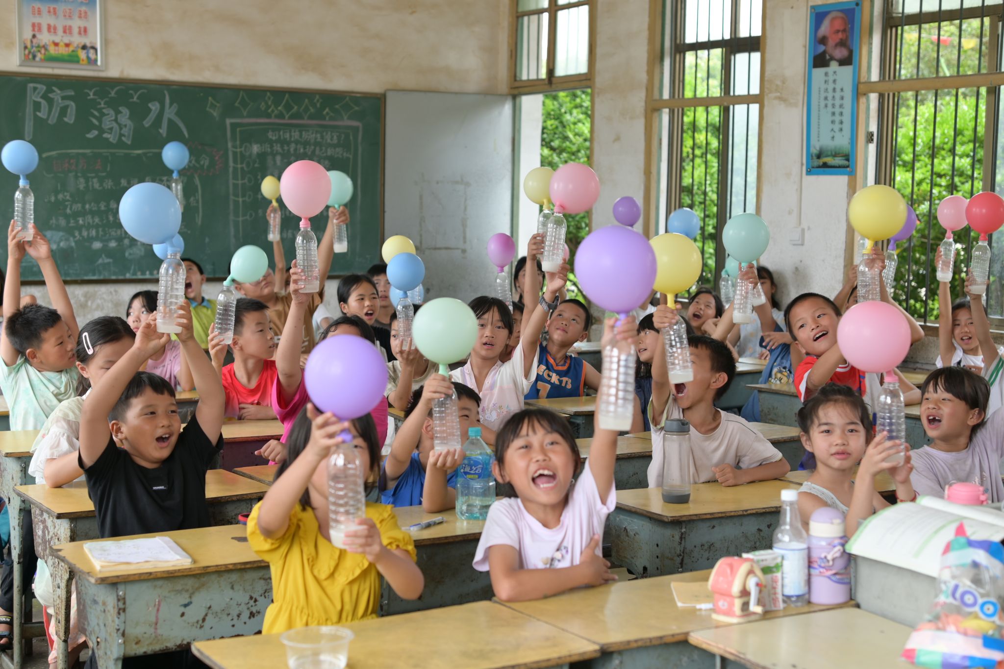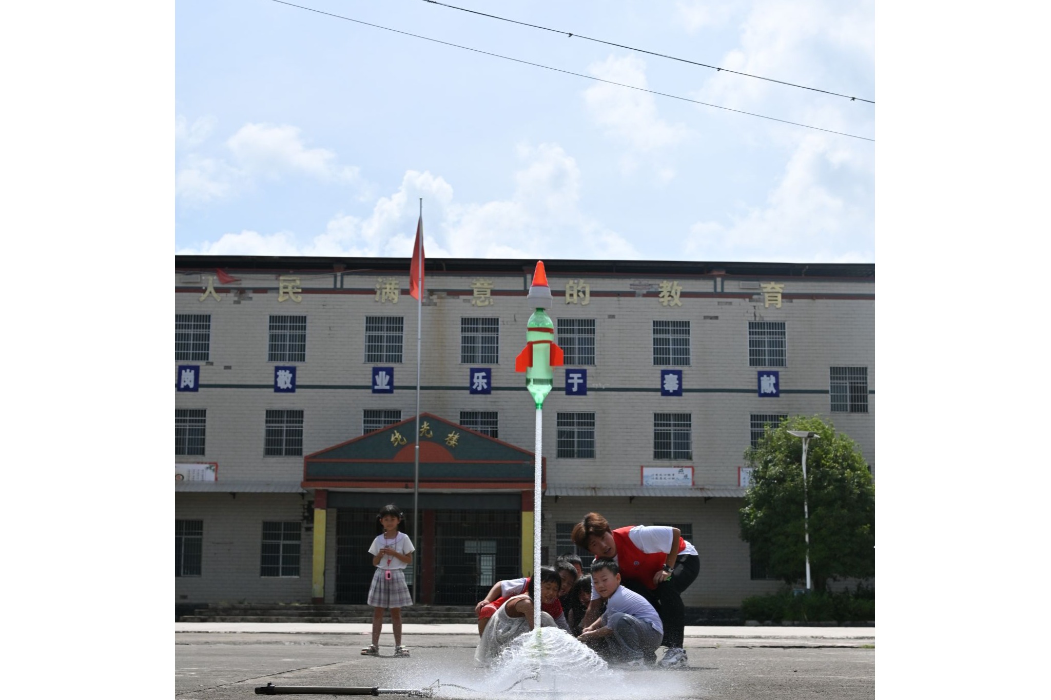 7月17日,物理2302班朱浩天带领学生们上了一堂精彩的水火箭实验课。课堂上,他先细致讲解了水火箭升空的原理,随后让孩子们用贴纸装饰提前准备好水火箭模型。接着,部分志愿者带同学们到操场,另一部分则负责给火箭装水、打气,最后在师生共同协作下拉动开关,水火箭瞬间冲天而起,引得孩子们欢呼雀跃,科学探索的热情在实验中被充分点燃。