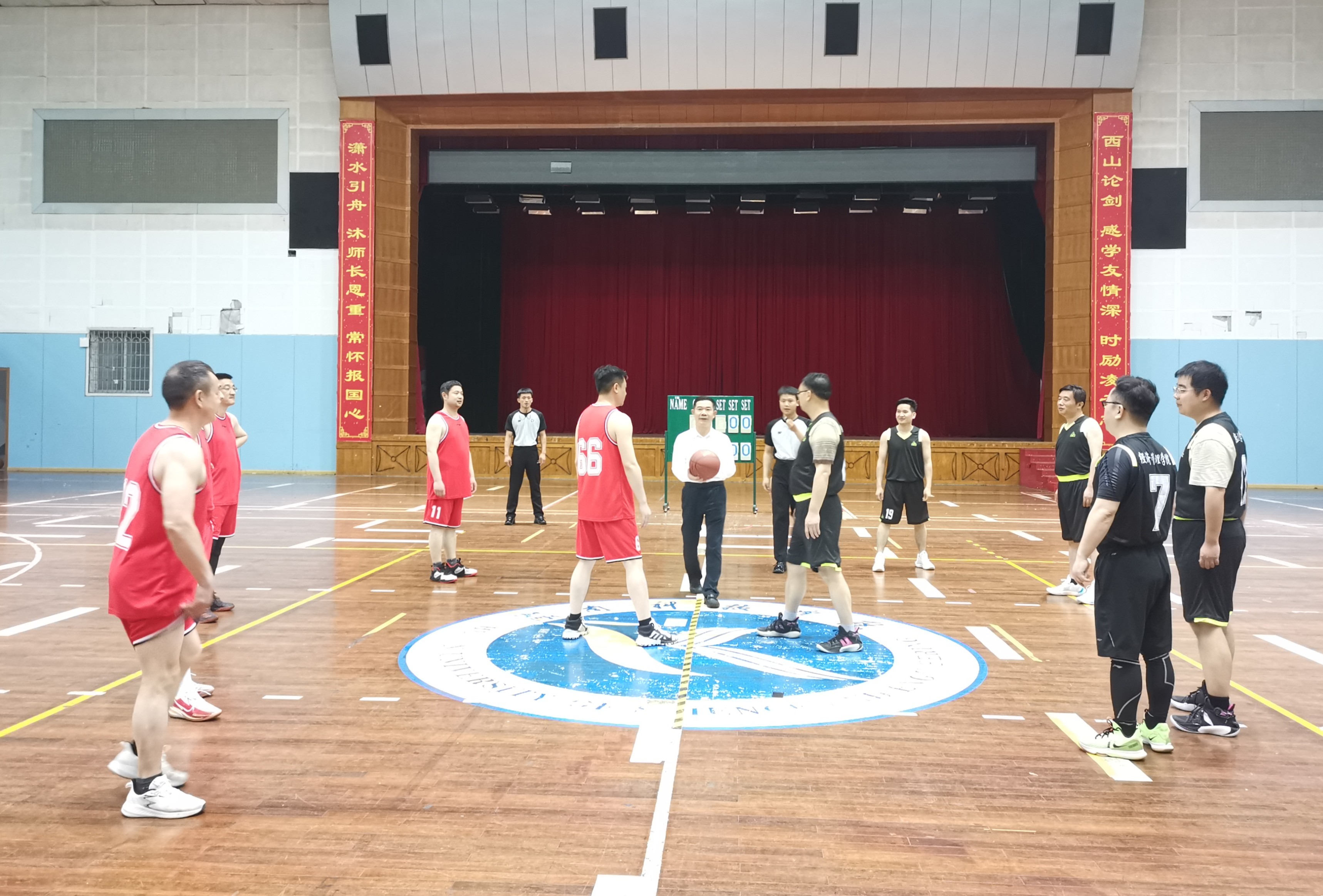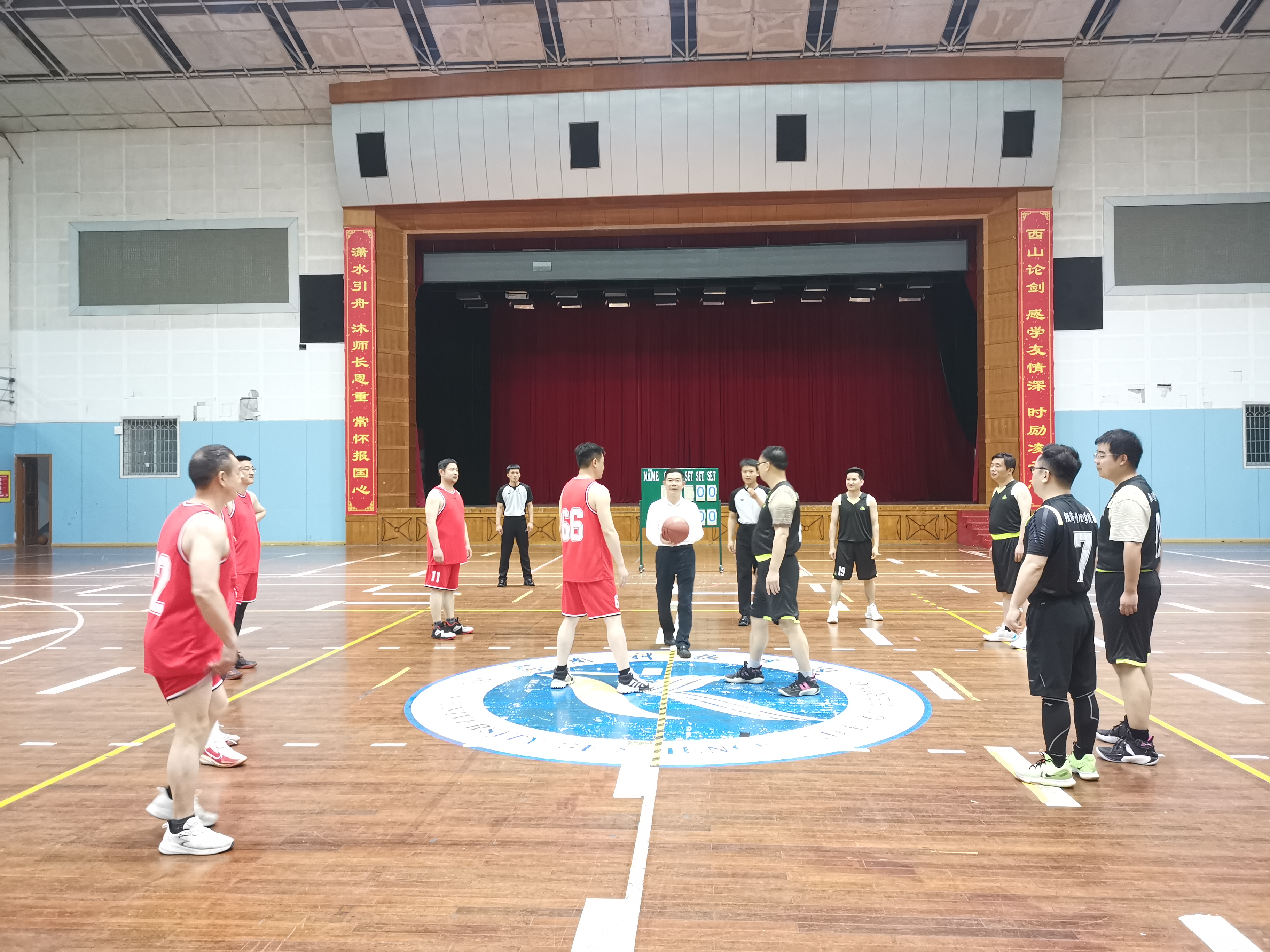 本网讯(记者 狄晨煜 彭芸)为丰富教职工文化生活,营造学校健康竞技氛围,5月16日,“迎篮而上向未来 踔厉奋发新征程”——学校第九届教职工暨“清廉杯”男子篮球赛正式开赛。党委委员、副校长吴小林宣布比赛开幕。本次篮球赛共有12支球队参赛,为期9天。