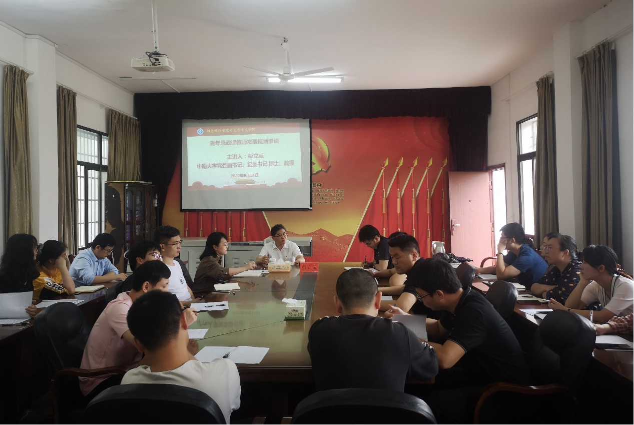 该培训班首堂讲座邀请到中南大学党委副书记、纪委书记彭立威教授担任主讲。彭立威以“青年思政课教师发展规划漫谈”为主题,结合自身发展经历,围绕“五讲”与我院青年思政课教师深入谈心交流。一是讲规划。要根据自己的发展实际,在不同阶段设立发展目标,并朝着目标不断迈进。二是讲勤奋。天道酬勤是中国古人经验的总结,放在现在依然具有启迪作用。三是讲学习。要把学习当成一种习惯,不断的充实和提升自己,为下一步进阶做好知识储备。四是讲经营。既要经营好资源,更要经营好自己,学会为人处事,懂得感恩。五是讲奉献。不要做精致的利己主义,要乐于奉献,甘于奉献。彭立威希望,作为马院的青年教师,要把个人的发展与时代的需要紧密结合起来,不辜负自己的青春和新时代给予的机遇。