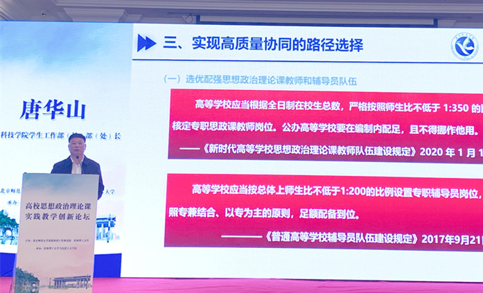 唐华山从“高质量协同的时代价值”“高质量协同的科学内涵”“实现高质量协同的路径选择”“地方本科院校思想政治理论课教师与辅导员高质量协同的探索”四个方面进行了阐述。他指出,高校要坚持立德树人根本任务,凝聚三全育人共识,推动实现“人人、处处、时时”协同育人,充分用好思想政治理论课教师和辅导员这两支思政育人队伍,发挥思政课教师的理论优势和辅导员的日常管理经验,促使两支队伍在育人的价值取向、目标追求、任务落实等方面协调一致、同心同向,实现育人成效最大化。他还向与会人员详细介绍了学校在思政课实践教学、学生日常管理、辅导员科研提升、学生评价改革等方面的特色工作。主题报告既有理论高度又有实践深度,受到与会代表的广泛关注和一致好评。