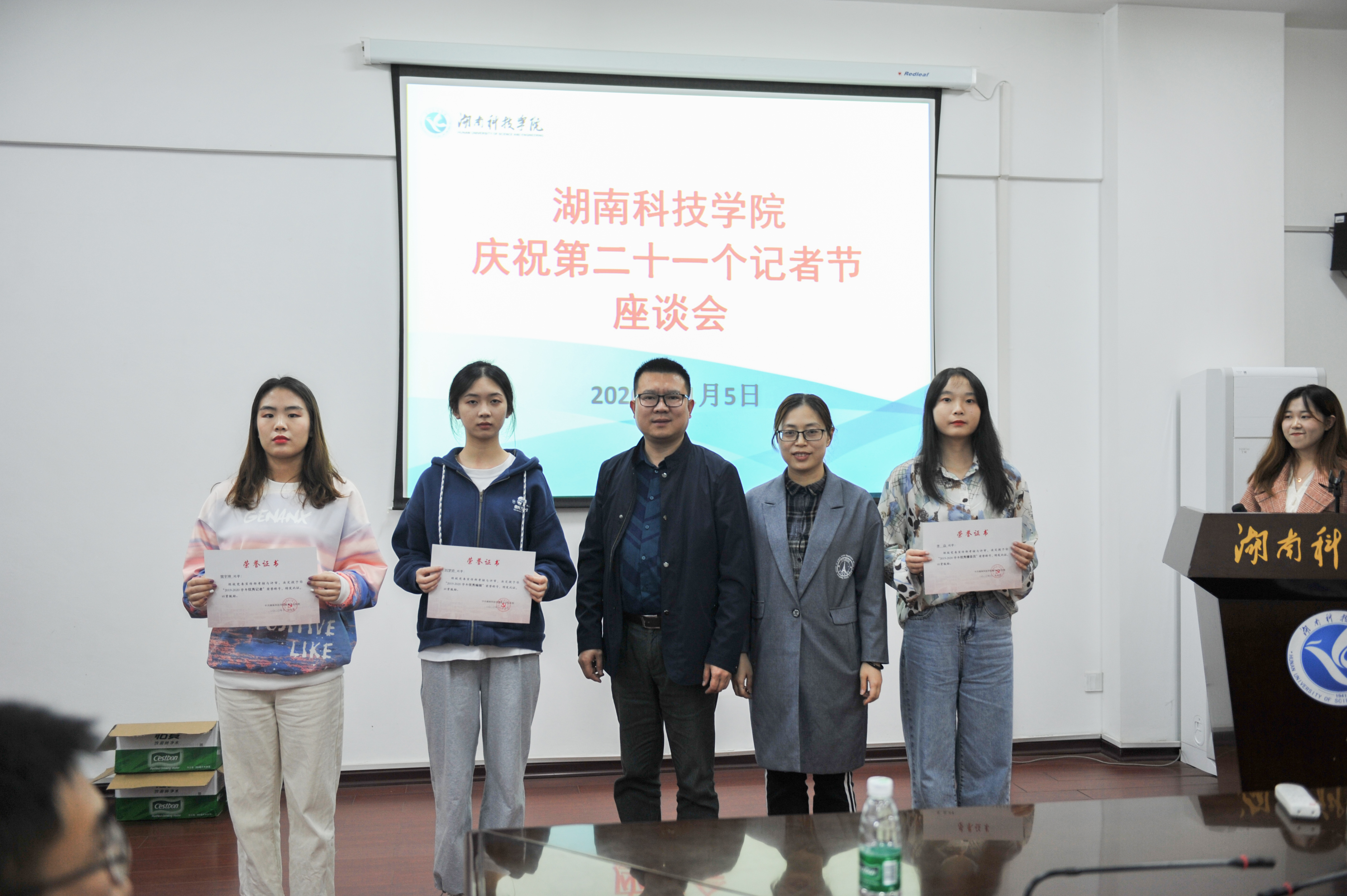 本网讯  11月5日晚,学校宣传部举行座谈会庆祝第二十一个记者节,并对2019-2020年度的优秀记者、优秀编辑、优秀播音员予以表彰。机关党委书记林泽红、党委宣传统战部副部长陈玉皎以及宣传部的全体老师、融媒体中心的学生记者代表参加。