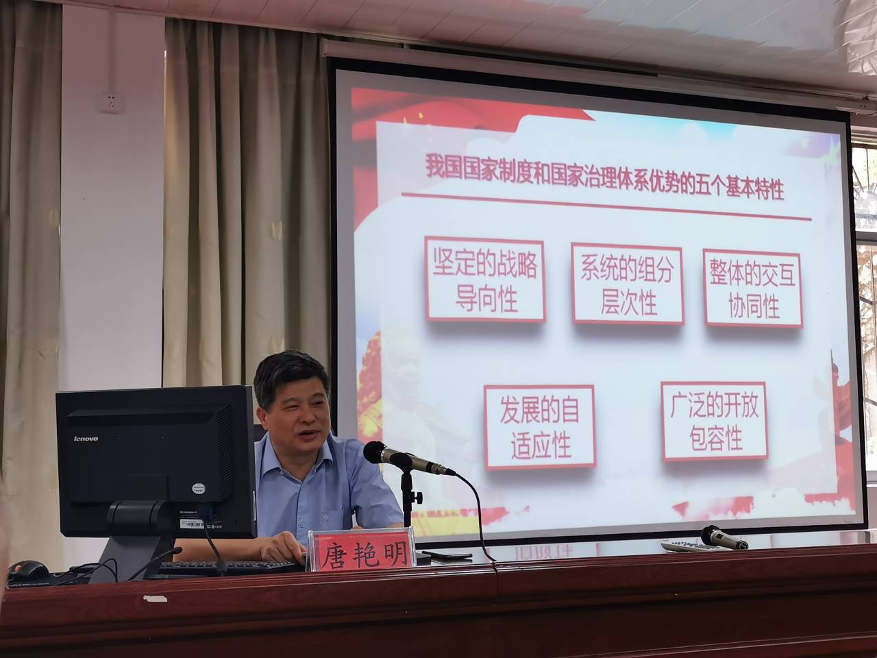 唐艳明紧紧围绕“两个一百年历史交汇点上的政治宣言”这一主线,深刻解读了党的十九届四中全会召开的历史背景和重大意义,梳理了中国特色社会主义制度和国家治理体系13个方面的显著优势,对全会《决定》提出的总体要求、总体目标和重点任务进行了系统阐释。同时,对加强学校治理体系和治理能力提出了自己的思考。党课既全面系统、又突出重点,既有理论高度,又有实践深度,对全体党员干部深入学习贯彻党的十九届四中全会精神具有重要的指导意义。
