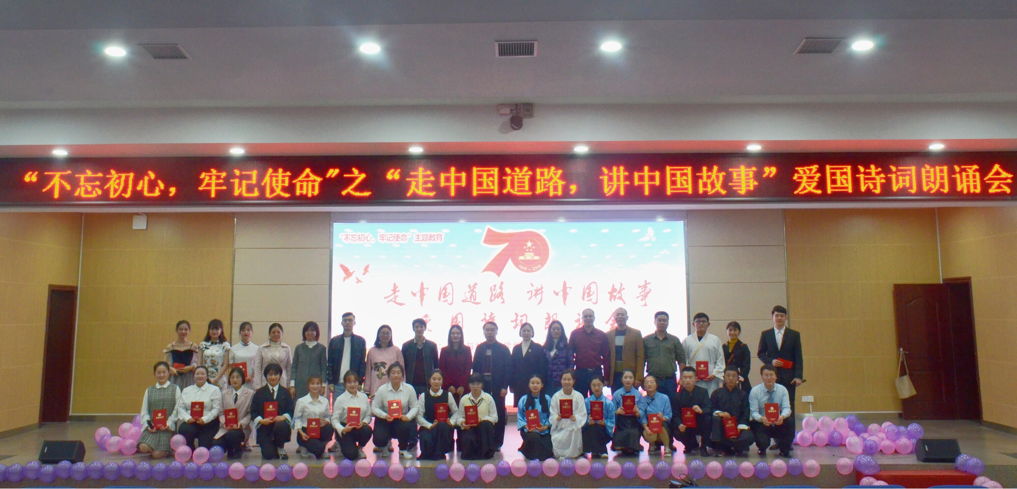 本次比赛中的九组选手,他们伴随着或悠扬或激昂的音乐,声情并茂的朗诵了《将进酒》《少年中国说》《大漠敦煌》《青春的印记》《我骄傲,我是中国人》等经典诗词,他们精神饱满、感情充沛,用诗词深情倾诉着对祖国热爱。比赛间隙,法学专业、汉文专业、秘书专业和预科班的全体同学齐唱爱国歌曲,将现场气氛推向高潮。