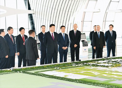 2019年9月25日上午,北京大兴国际机场投运仪式在北京举行。中共中央总书记、国家主席、中央军委主席习近平出席仪式,宣布机场正式投运并巡览航站楼。这是习近平在综合交通中心听取机场综合交通体系建设情况介绍。 新华社记者 谢环驰/摄