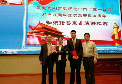 4月27日,民盟永州市委举行纪念中共“五一口号”发布70周年暨改革开放40周年系列活动之知识抢答赛和演讲比赛,vwin德赢民盟支部参加了比赛,永州市委常委统战部部长石艳萍、民盟永州市委主委袁火林到场观看。