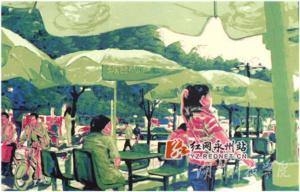 “回到永州的第三年,也就是2008年,我创作了版画《零陵人》系列,取材于古城零陵的生活片段,画中的人物健步疾行,无论是老人还是姑娘都是那么信心满满悠然自得,旨在表达自己对身边人和事的真实感受。零陵对于我来说,可谓艺术之源。这里历史悠久,人文璀璨。我长于斯,也执教于斯、画于斯,对这里的人和事有着深切的感受和眷恋,所以,我通过丝网版画强烈的色彩感受较为真实的呈现出来。”