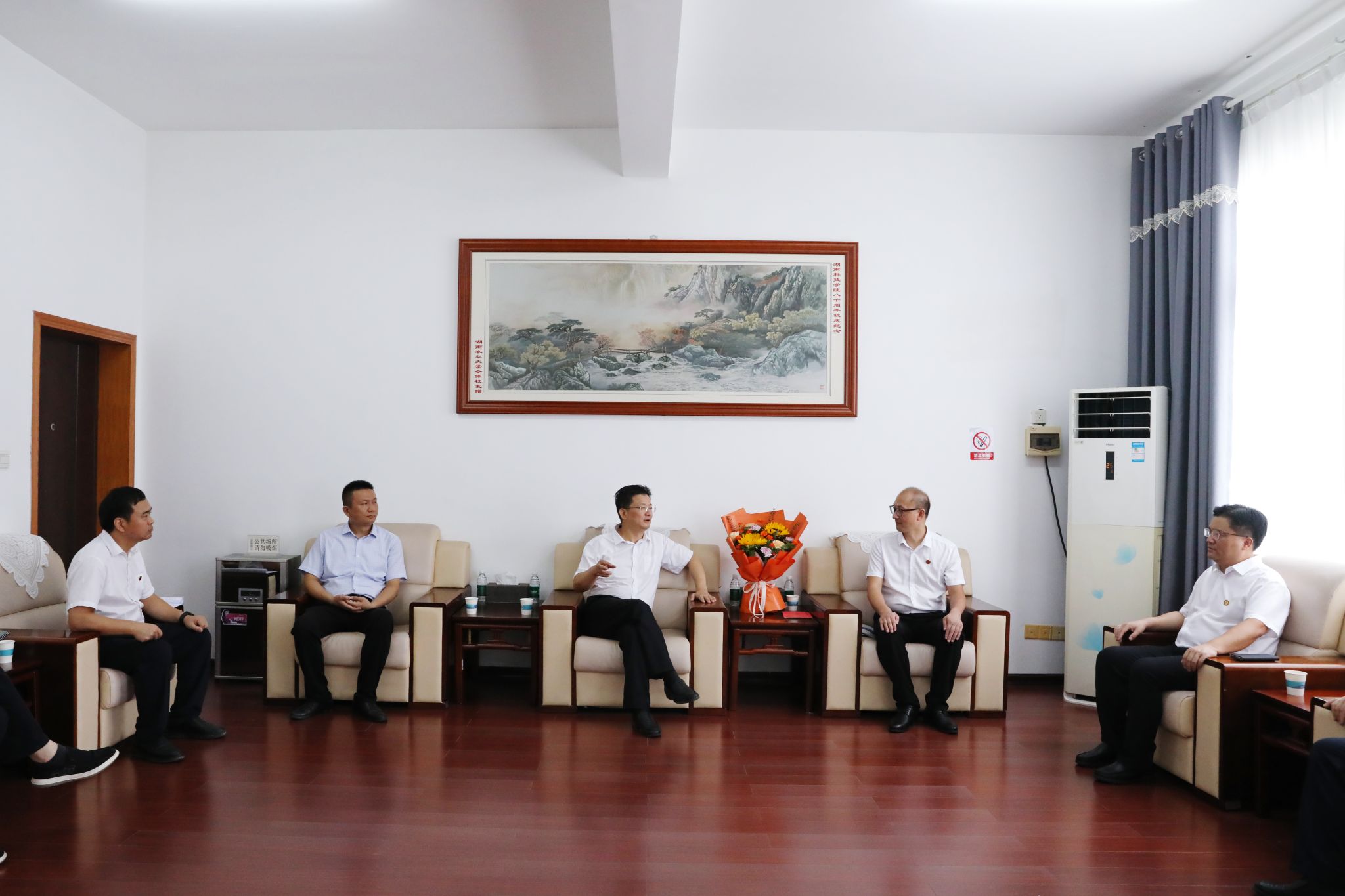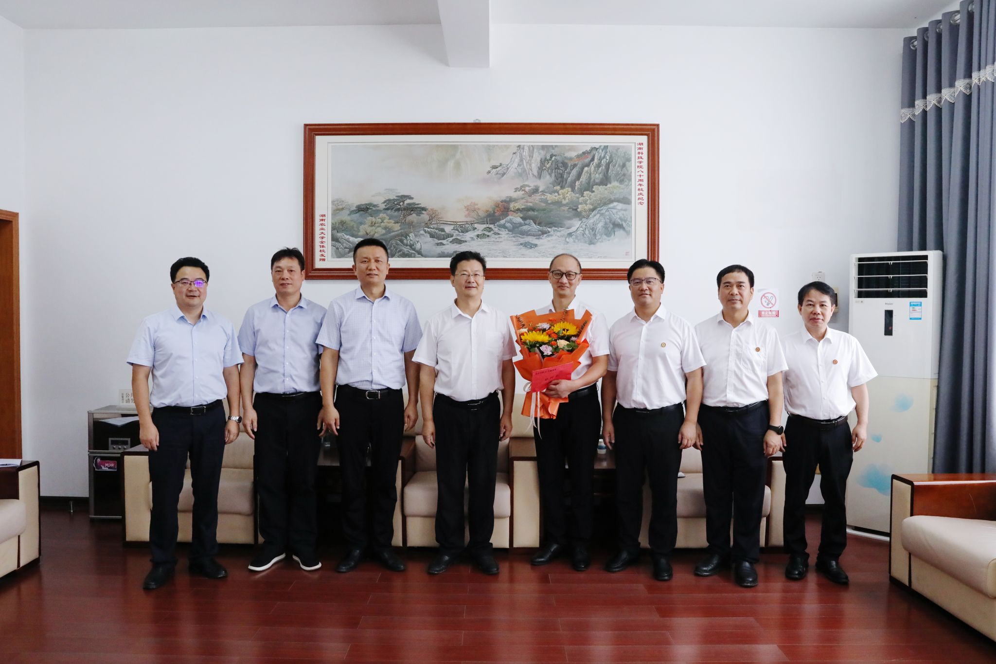 陈爱林与周基教授亲切交谈,详细询问其在教育教学、科研工作等方面的情况,对他长期以来的辛勤付出表示充分肯定,并勉励他牢记为党育人、为国育才使命,为永州地方经济社会发展培养更多高素质人才。