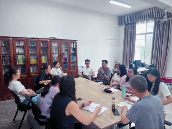 活动中,《基础日语》课程组围绕 “日语被动语态” 备课,眭玉芳老师提出 “情境演绎法”;《日本概况》课程组聚焦 “中日茶文化比较”,刘艳红老师借视听材料引导跨文化思辨。集体研讨环节,教师们打破界限交流,王紫玉老师建议设计 “句子变身” 游戏,何建军教授提议用台风停产新闻导入教学。