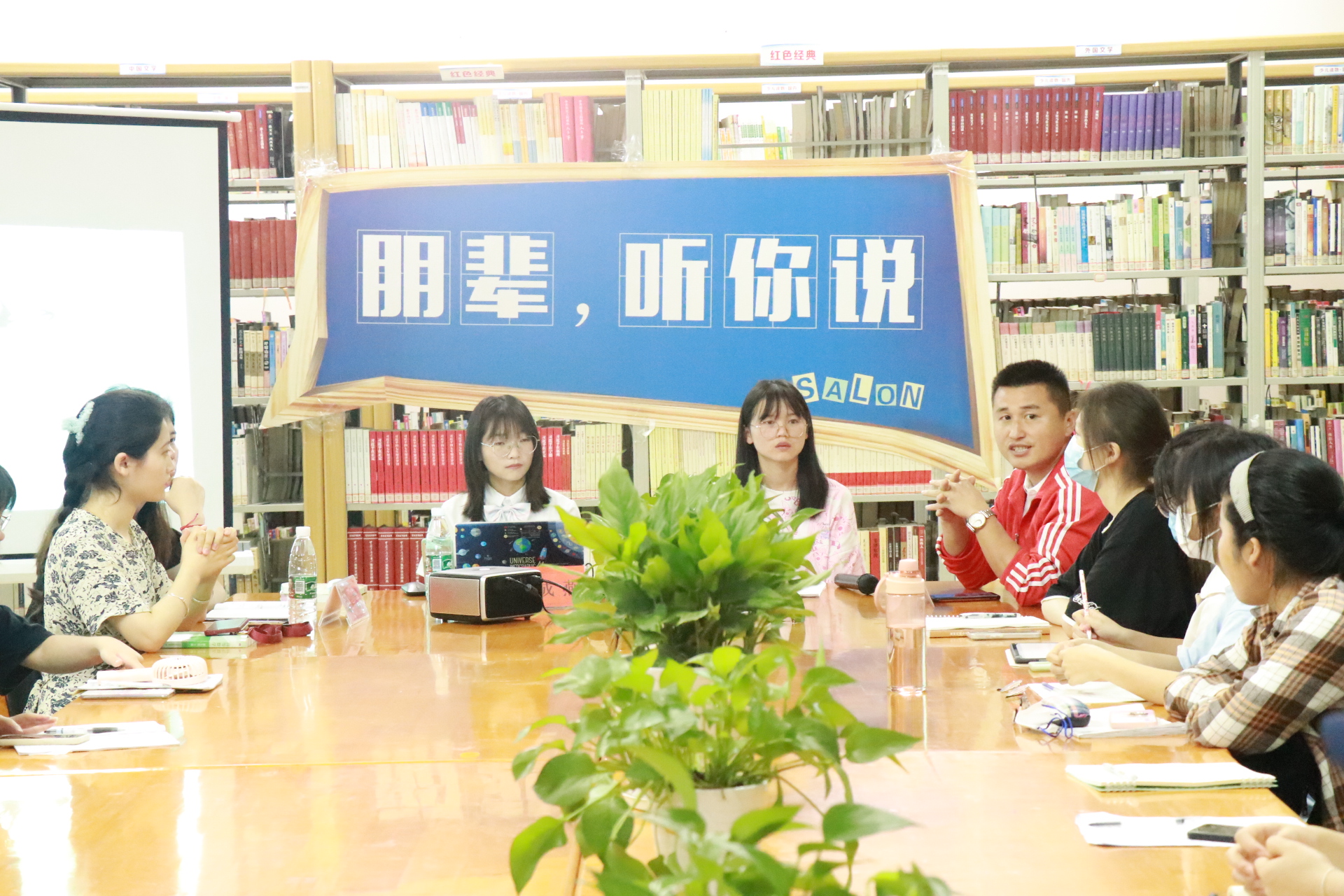 本网讯 4月26日晚,“阅读,净化心灵”之“朋辈,听你说”沙龙第四期如期举行,图书馆地方文献部主任吴翠云老师、外国语学院心理专干刘罗老师、文法学院心理专干龙慧老师应邀出席,40多位朋辈心理互助员参加。