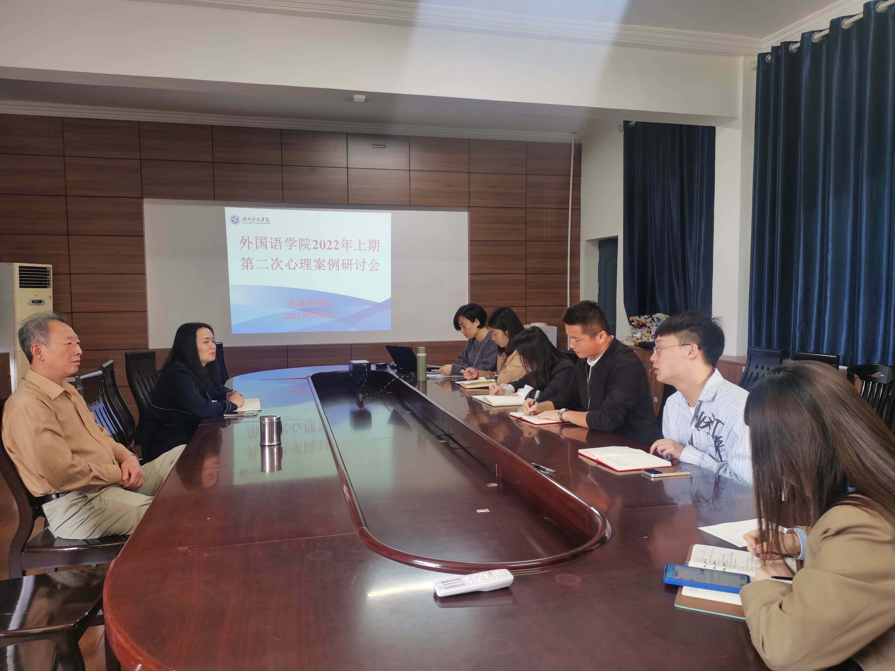 为严格落实“五早”、“五个一”工作机制,5月2日上午,外国语学院在博雅楼202会议室召开2022年上期第二次心理案例研讨会,外国语学院院长欧华恩、党总支书记张剑、党总支副书记罗晶、全体辅导员、部分班主任共同与会,会议由党总支副书记罗晶主持。