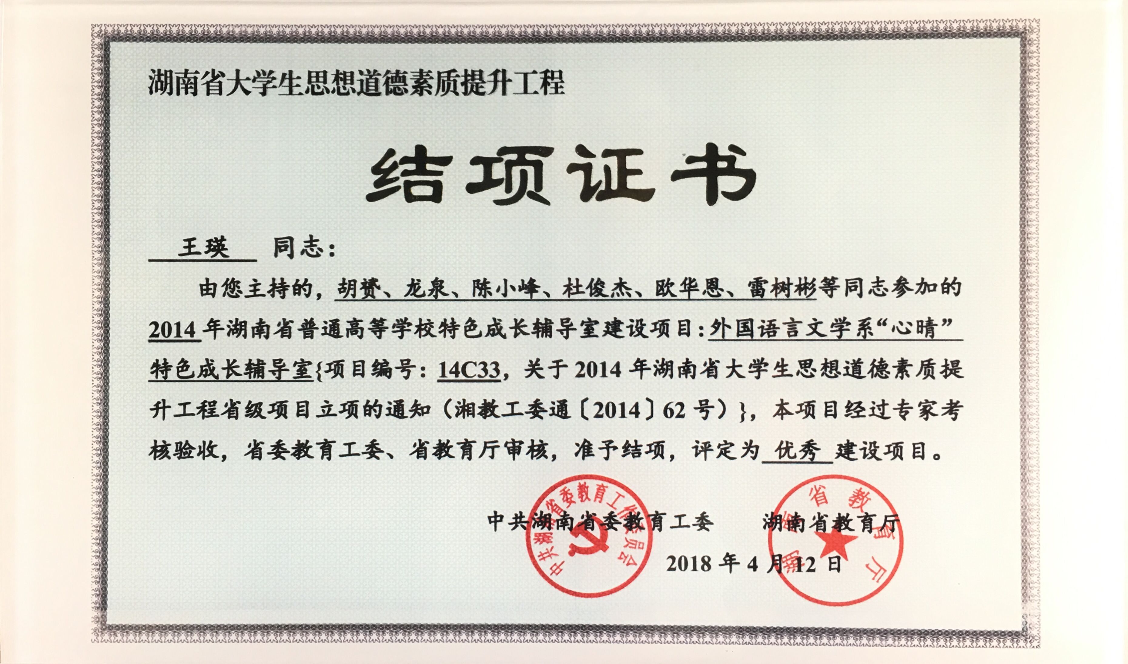 本网讯(胡赟)近日从湖南省教育厅传来喜讯,由vwin德赢外国语学院党总支副书记王瑛牵头主持的湖南省大学生思想道德素质提升工程“心晴”特色成长辅导室建设项目,在全省104个成长辅导室建设项目中脱颖而出,验收等级为优秀,据悉全省仅6所高校获此殊荣。“心晴”特色成长辅导室自2014年立项筹建以来,秉承“根据学生成长需要提供贴心服务”的工作理念,充分依托“菁菁书院”的六间主体功能室从思想引领、学业辅导、心理帮扶、就业创业指导等方面着力为学生成长提供全方位服务,及时疏导和解决外语专业学生在成长过程中遇到的各种生活、学习、就业、心理、情感等问题,构建工作前移、重心下移的思想政治教育模式,切实提升了学生工作的针对性和实效性。