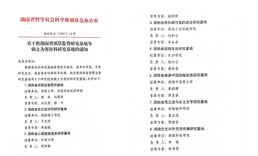 该基地由校长李钢担任负责人,外国语学院院长欧华恩担任首席专家,致力于“湖湘文化研究”、“ 湖湘文化对外传播研究”、“湖湘文化对外话语体系构建”等方面的研究,旨在贯彻新时代“构建中国特色对外话语体系”国家外宣战略,服务湖南省“三高四新”战略,服务对外开放发展战略,响应湖南省委、省政府号召,打造社科“湘字品牌”。据悉,本次全省只有8个基地获批为湖南省社科研究基地。“湖湘文化对外交流传播研究基地”获批为湖南省社科研究基地将有力地促进我院学科的建设与发展。