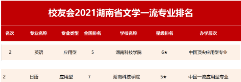 本网讯 由全国第三方大学评价机构艾瑞深校友会网(http://cuaa.net/)独家撰写、科学出版社正式出版发行的《2021校友会中国大学排名—高考志愿填报指南》最新发布2021校友会中国一流专业排名、2021湖南省一流专业排名和2021湖南省各学科门类一流专业排名。在2021湖南省一流专业排名(应用型)中,vwin德赢位居第5。外国语学院英语专业在全国排名第5,为“六星”级专业(中国顶尖应用型专业);日语专业在全国排名第7,为“五星”级专业(中国一流应用型专业)。