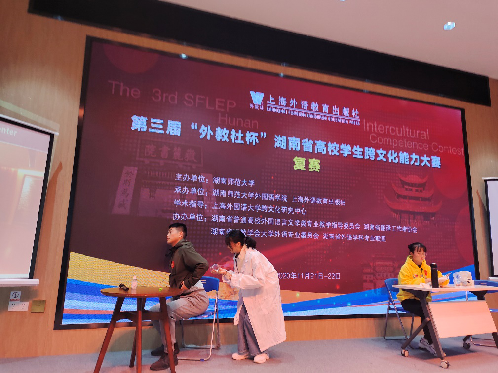 此次赛事由湖南师范大学主办,湖南师范大学外国语学院与上海外语教育出版社承办,湖南省高校外国语言文学类专业教学指导委员会、湖南省翻译工作者协会、湖南省高等教育学会大学外语专业委员会及湖南省外语学科专业发展联盟联合协办。大赛分为小组展示、案例分析和即兴回答三个环节,赛事难度较大,竞争激烈,本着以赛促学,以赛促教的精神,旨在搭建一个展示跨文化能力风采、交流跨文化教学经验的平台。