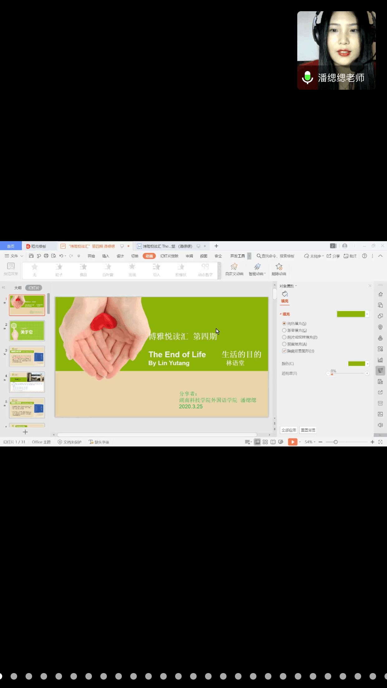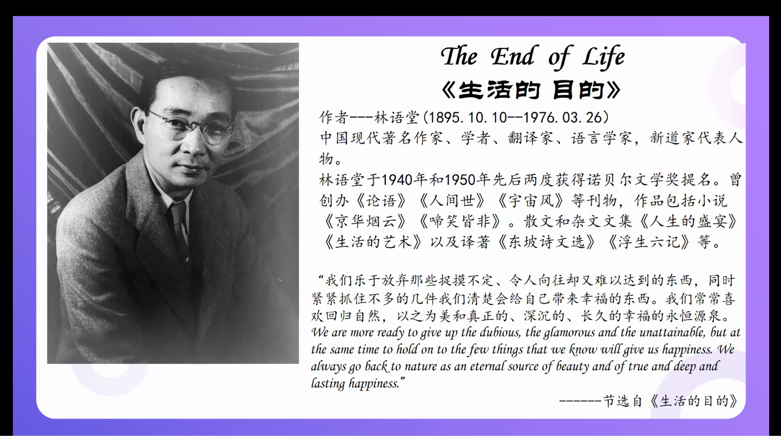 本次悦读汇邀请到的分享嘉宾是外国语学院专任教师潘缌缌,她曾荣获vwin德赢ac米兰官方网实验实训教学比赛一等奖、vwin德赢ac米兰官方网研讨式课堂比赛一等奖,她所分享的文章是林语堂的《The End of Love 生活的目的》。活动伊始,同学们以连麦的方式朗读了文章中自己喜欢的文段,并在评论区分享了自己在阅读过程中的所感所想。接着,潘缌缌老师为同学们介绍了文章写作的历史背景以及具体内容,以评论区互动的方式与同学们谈论了“生活的目的是什么”等系列话题。在倾听了同学们的朗读和感悟后,潘缌缌老师分享到:“从今天起,努力去做一个可爱的人,不羡慕谁,也不放弃目标,保持一颗萌萌哒的心,努力坚持进步。成长路上只有自己责无旁贷,所以你除了努力别无选择。真正重要的不是生命里的岁月,而是岁月里的生活。愿你们都能成为一个可爱的人”。