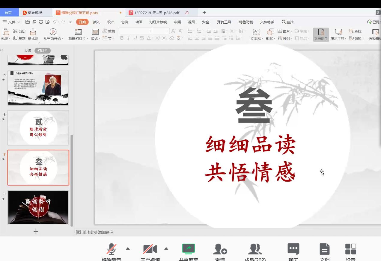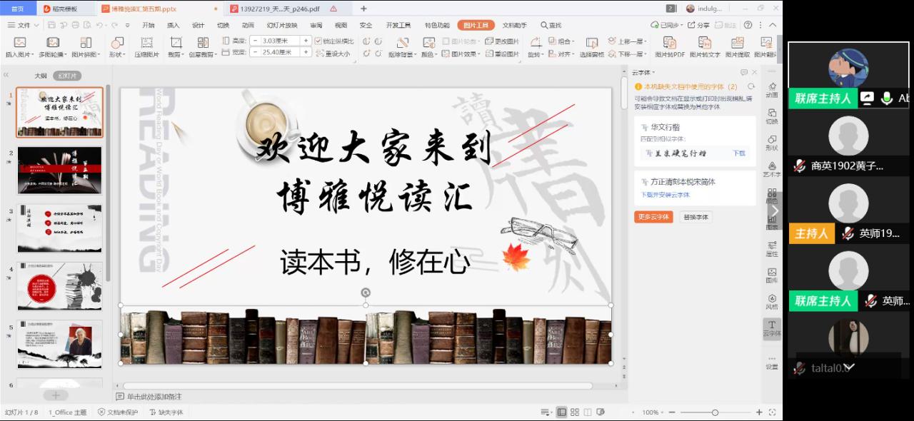本网讯(通讯员 黄子幸 唐嘉琪)“齐心抗‘疫’,停课不停学”。4月7日晚外国语学院菁菁书院品牌活动“博雅悦读汇” 于线上顺利举行,200多名学生主动报名参加。本次应邀和大家一起悦读的嘉宾是外国语学院专任教师陈碧园副教授,她从教20余年,主讲科目有《英美国家概况》等。此次她分享的书目是多丽丝·莱辛的《The Summer Before the Dark》。