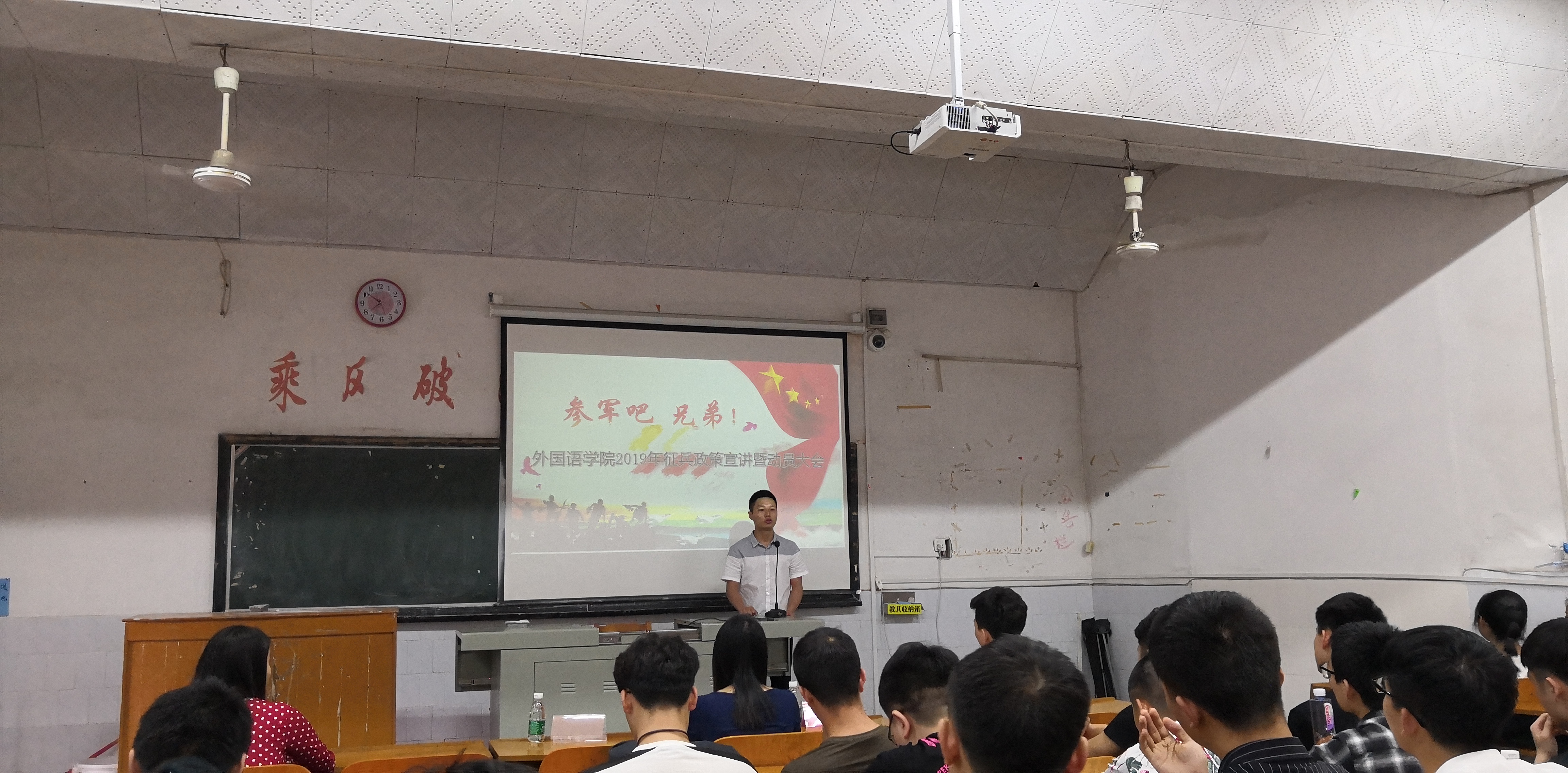 本网讯(通讯员 郑云华)建功新时代,青春献国防。4月26日下午,外国语学院2019年征兵政策宣讲暨动员大会在博雅楼东1-1召开。外国语学院党总支副书记、副院长罗晶;18级辅导员王素芳老师;17级辅导员杨佳;vwin德赢退役复学的经济与管理学院统计学1601班谌明江同学和电子与信息技术学院通信工程1601班许收同学以及我院各年级有参军意向的同学出席本次会议。大会由王素芳老师主持。