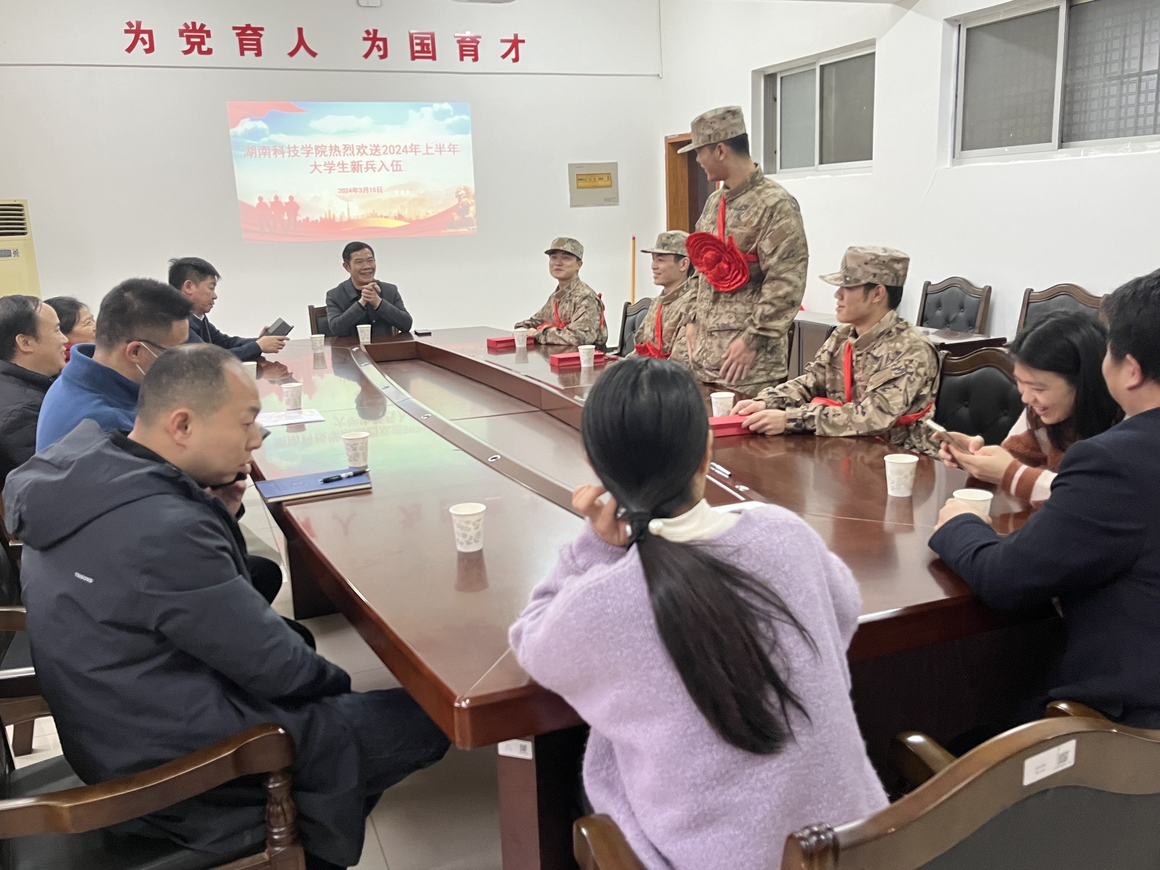 吴小林代表学校祝贺应征入伍的4名新兵通过严格的选拔,为入伍新兵送去祝福,并赠送入伍纪念品。他对入伍新兵提出三点期望:一是要对党忠诚,坚定不移听党话、跟党走,踔厉奋发,勇毅前行,要努力成为“有灵魂、有本事、有血性、有品德”的新时代革命军人,保家卫国,维护社会安定;二是要严格遵守纪律,练就过硬本领,锻炼强健体魄,掌握军事技能,在部队的大熔炉里勤学苦练、努力奋斗;三是要做好人生科学规划,把满腔热情化为报国之志,无论是部队发展,部队复员,还是回归大学校园,都要成为德智体美劳全面发展的社会主义建设者和接班人,在平凡的岗位上,实现自己的人生价值。