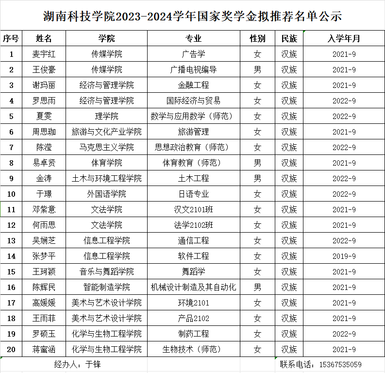 根据湖南省教育厅等5部门关于印发《湖南省学生资助资金管理办法》的通知(湘财教〔2022〕13号)、湖南省学生资助管理中心《关于做好2024年普通高校国家奖助学金评审工作的通知》(湘学助〔2024〕30号)文件要求和《vwin德赢ac米兰官方网学生奖励办法》、《vwin德赢ac米兰官方网学生资助管理办法》、《vwin德赢ac米兰官方网国家奖学金、国家励志奖学金、国家助学金管理办法》有关规定,学工部于2024年9月25日召开资助专干会议,安排部署评奖工作。经学生个人申请,各学院初审、公示,学工部审核。拟推荐化学与生物工程学院蒋蜜涵等20名同学参评2023-2024学年国家奖学金。