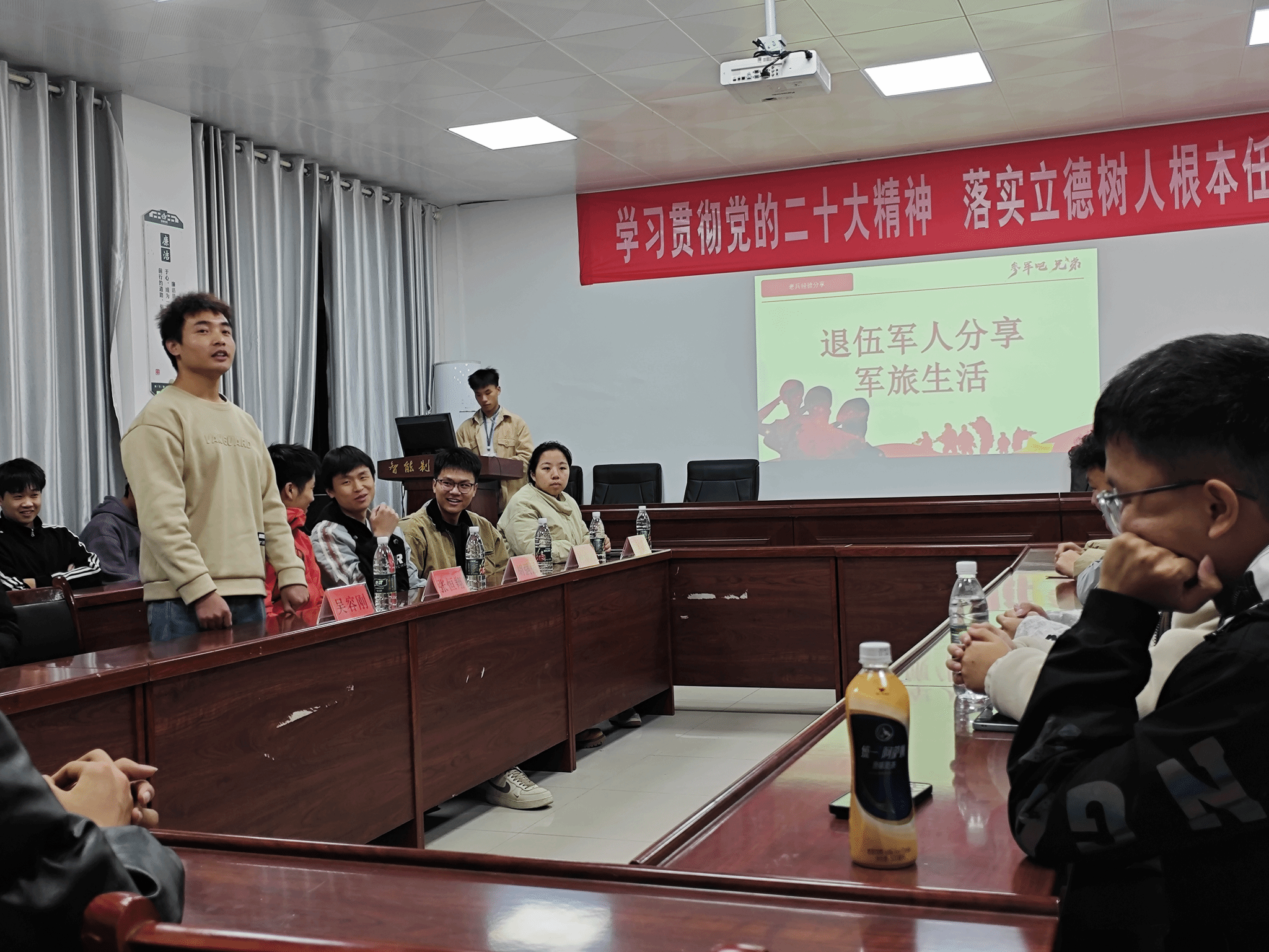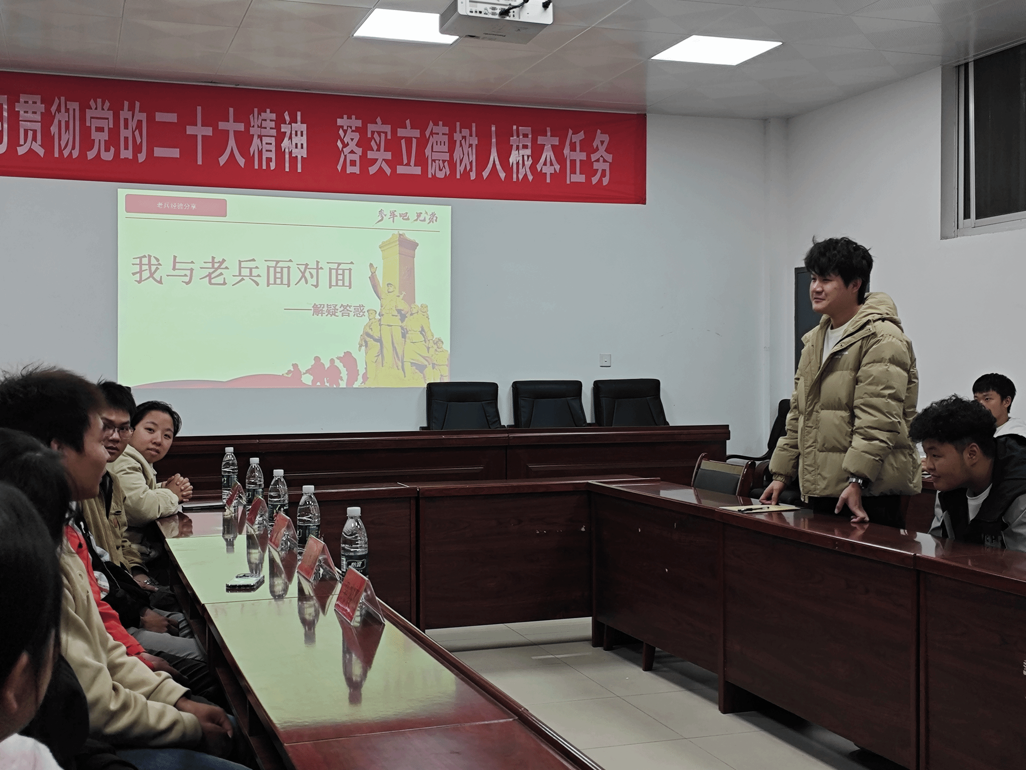 本网讯(通讯员 粟欣 谷懿)11月25日晚,一场别开生面的“我与老兵面对面”征兵宣传活动在致远楼103热烈展开,吸引了众多有志青年的参与。