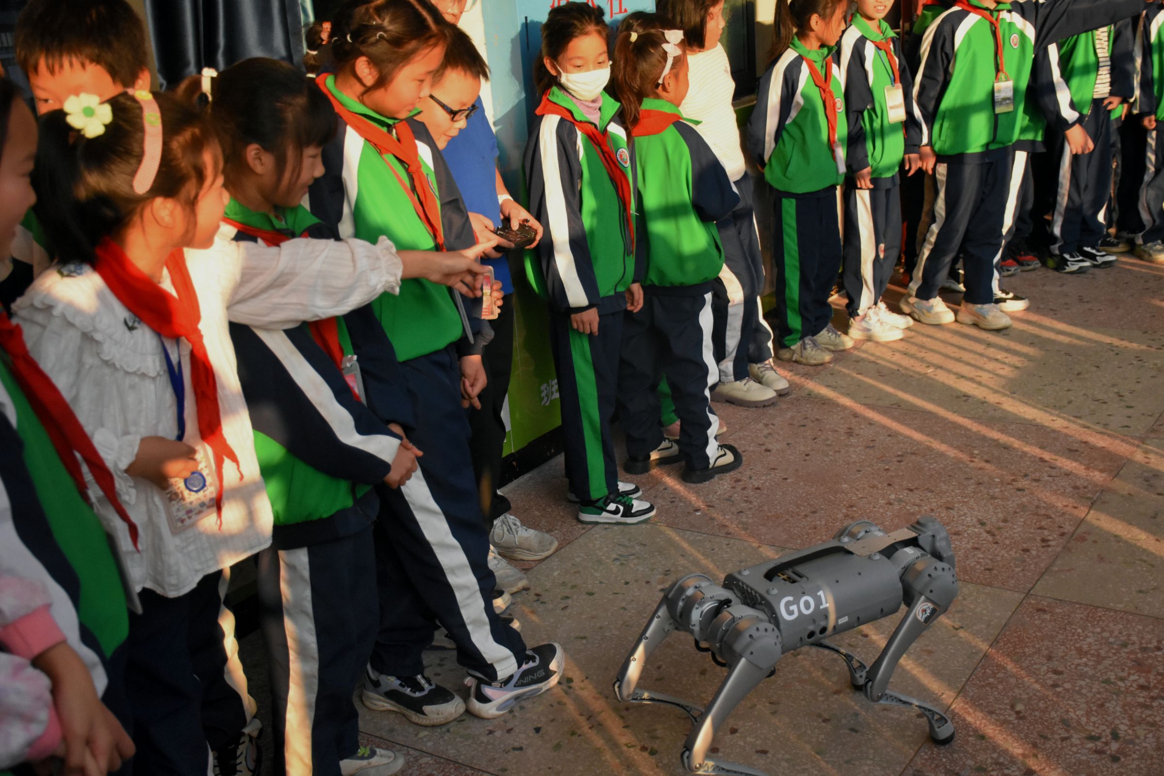 “它会动吗?”“它当然会动啦,它可是机械狗。”课后,孩子们纷纷探出好奇的小脑袋,目光聚集在两个机械狗上,趴下、起立、跳舞,志愿者摆弄着机械狗做出一个个动作,走廊充溢着孩子们的欢声笑语。