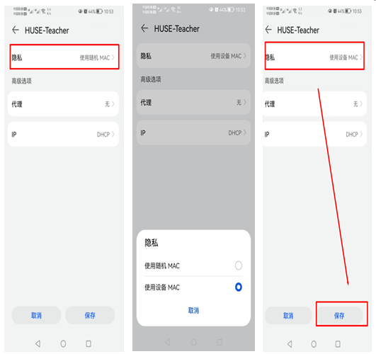 第四步:单击隐私设置,将使用私有MAC地址更改为使用设备MAC地址,保存退出。