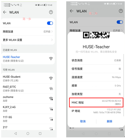 第二步:单击已连接的校园网wifi,出现如下界面,手机MAC地址为随机地址,如红框所示,则进行下一步。
