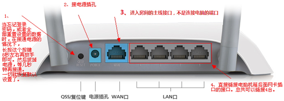 (2)路由器设置说明:以TP-LINK路由器为例,若路由器系统密码忘记可长按复位键恢复出厂设置后进行登录。