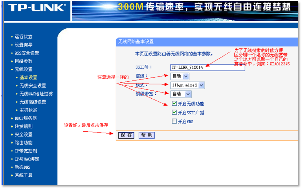1)如图,点击左侧栏的【无线设置】,如图: