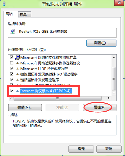 (4)双击【Internet协议版本4(TCP/IPV4),或选中【Internet协议版本4(TCP/IPV4)】点击【属性】。