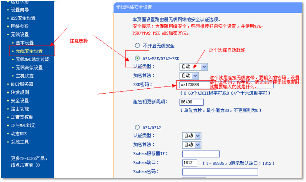 3)设置【无线安全设置】对无线信号网络进行加密,选择【WPA-PSK/WPA2-PSK】加密即可。此密码为无线设备连接无线时需要输入的密码。设置完成后 保存设置。