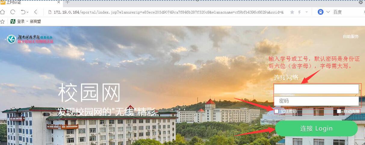 (3)打开浏览器自动弹出认证界面,点击“记住密码”和“自动连接”(下次打开浏览器点任一链接,自动登录不用再输入用户名和密码),输入用户名和密码点“登录”,如图2.3所示: