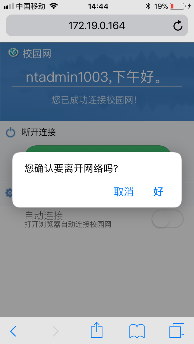 (7)如要下线,请点击“下线Logout”,在弹出的对话框里点击“好”即可下线;如在使用过程中如需手工下线,输入http://eportal.huse.cn占击“下线Logout”再点击“好”。如图1.6