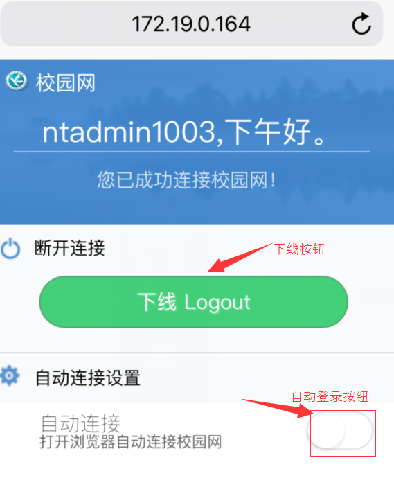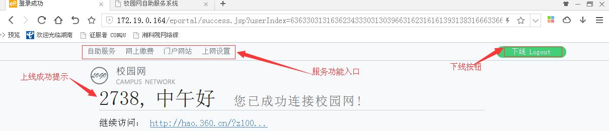 (4)登录成功后显示如图2.4界面,有服务功能入口按钮及下线按钮。在此界面中也可点“下线logout”进行下线。如果本页被关闭,则在浏览器中输入http://eportal.huse.cn进行下线。
