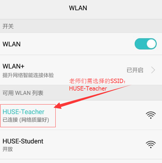 (3)老师连接SSID名为“HUSE-Teacher”的热点,学生连接SSID名为“HUSE-Student”的热点,如图1.3所示。连接成功后即将获得校园网分配置的IP地址,此时可访问学校所有的免认证资源,如http://ns.huse.cn。